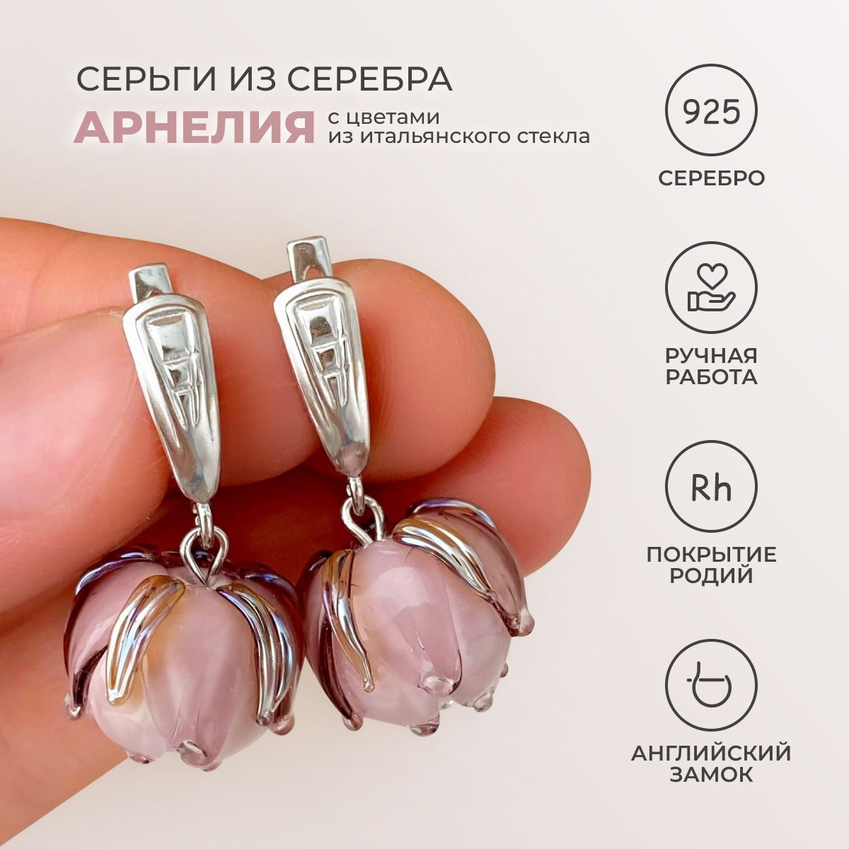 Серьги серебряные женские "Арнелия" с цветами из муранского стекла - это уникальные украшения ручной работы. Ослепительный блеск родированного серебра 925 и необычайная красота цветов из муранского стекла - все это отличает наши серьги и делает их истинным произведением искусства.Нежный розовый оттенок добавит в Ваш стиль женственности и подчеркнет безупречный вкус. Просто оцените эту красоту! Мы долго и тщательно работали над каждой деталью, чтобы создать нечто эксклюзивное. Такие серебряные серьги будут по-настоящему украшать и радовать свою обладательницу.Не упустите возможность украсить свою коллекцию ювелирных изделий нашим дизайнерским украшением! Серьги из серебра "Арнелия" - отличный выбор для молодых девушек и взрослых женщин. Они прекрасно подходят для повседневной носки. Носите их на вечеринках, свиданиях и в повседневной жизни и наслаждайтесь каждым мгновением!